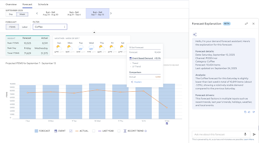 Delivers natural-language explanations of demand forecasts, showing what factors influenced the prediction (e.g., promotions, weather, historical trends) and whether manual edits were applied. Managers can also simply ask questions like, “Why does Saturday’s forecast look higher than last week’s?” and instantly get a breakdown of the contributing factors applied to the forecast.
